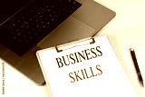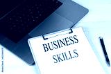 BUSINESS SKILLS word on clipboard on laptop with calculator and pen
