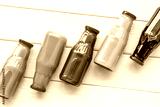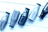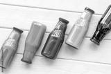 bottles with fresh carrot, tomato, apple, cucumber, lemon, pomegranate juices on green background top view copyspace