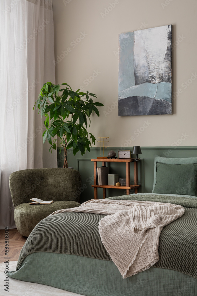Modern and colorful interior of living room with design boucle sofa, mock up poster, shelf, plants, decorations and personal stuff. Home decor..