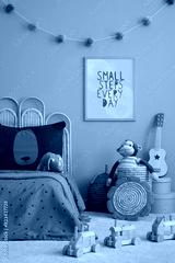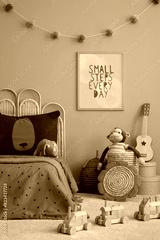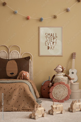 Aesthetic composition of child room interior with mock up poster frame, braided basket, guitar, wooden block toys, plush monkey, colorful garland and personal accessories. Home decor. Template.