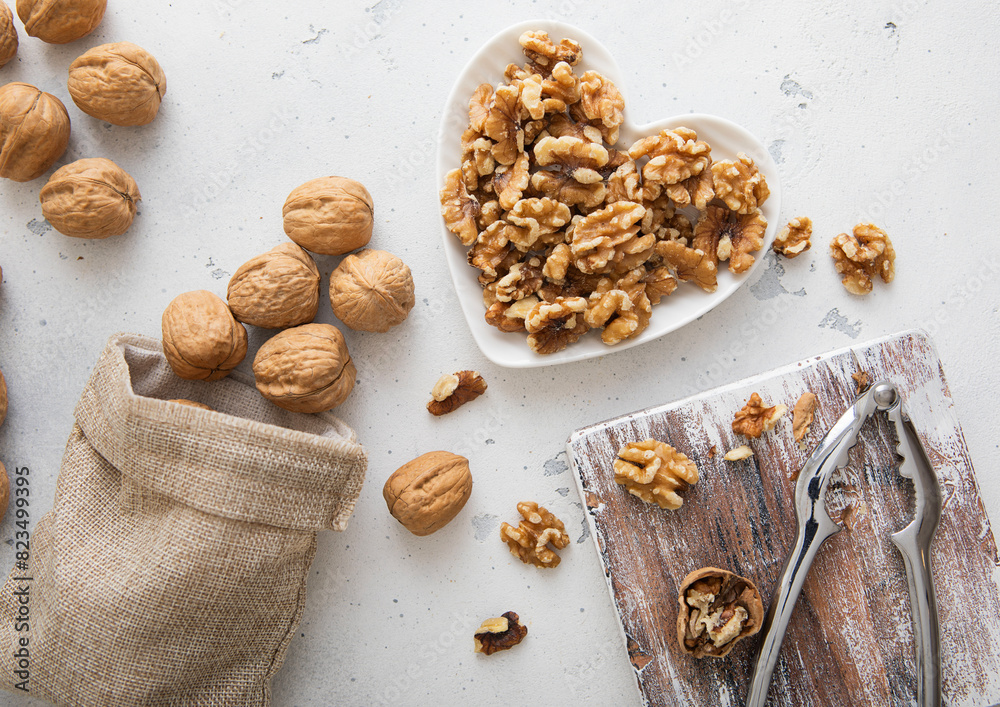 Whole and peeled walnut nuts with cracker and linen bag on light background.Macro.