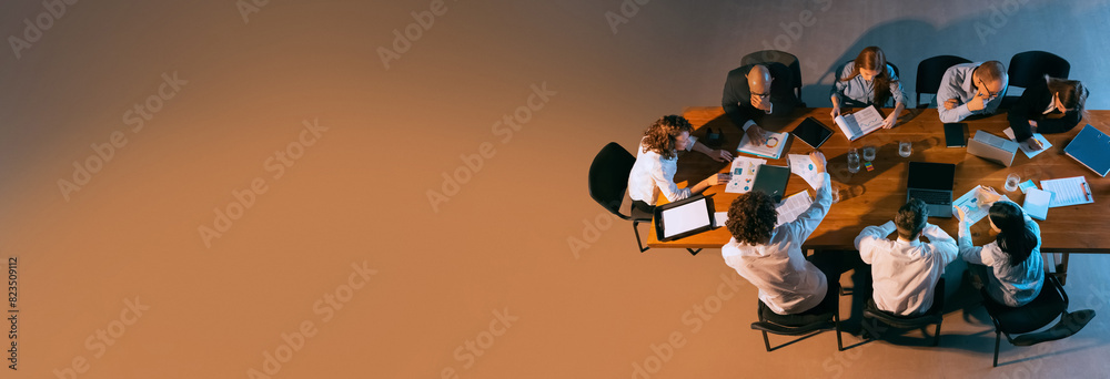 Team of business professionals deeply engaged in strategic planning session, surrounded by laptops, documents, and reports. Concept of business, entrepreneurship, career, teamwork. Banner