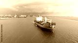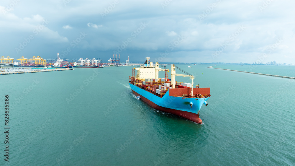 container ship sailing in sea, shipping business and industry service of cargo logistic import and export international freight transportation by container ship in open sea, aerial view