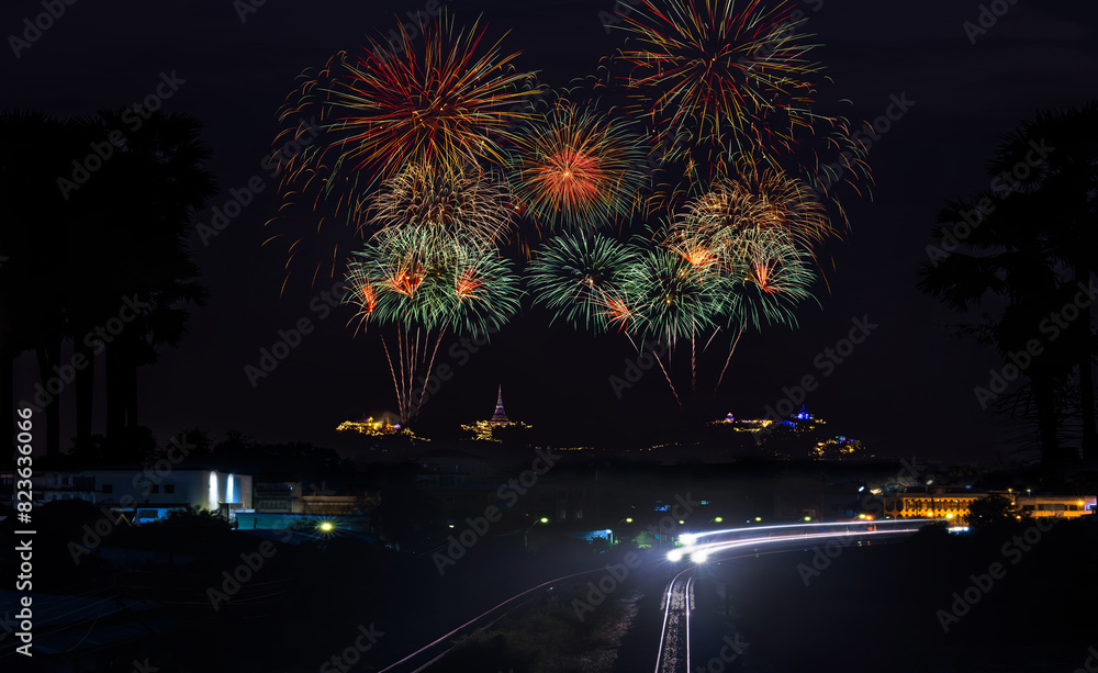 Fireworks show over Phra Nakhon Khiri Historical Park (Khao Wang), Petchaburi, Thailand, head light train in front, for backgrounds.