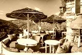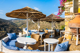 Cafe restaurant with sun umbrellas and beautiful mountain view in Kastro village, Sifnos island, Greece