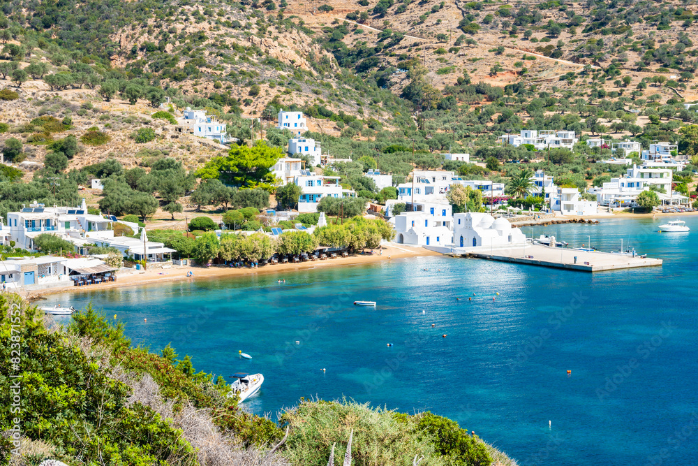 View of azure sea bay and sandy beach in Platis Gialos village, Sifnos island, Greece