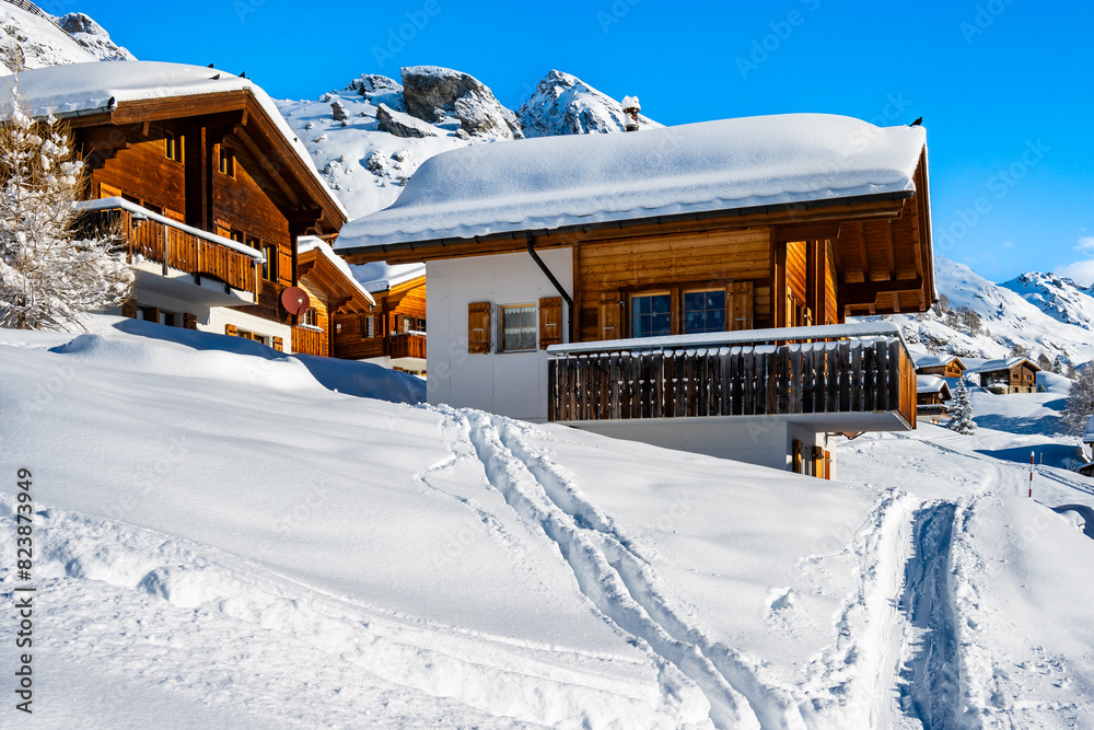 Traditional alpine wooden houses in winter mountain snow landscape, Loetschental valley, Switzerland