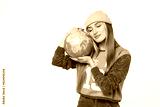 Cheerful caucasian eco-friendly young woman hipster embracing hugging globe, protecting against coronavirus pandemic pollution contamination isolated in white