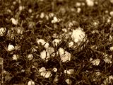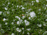 CLOSE UP: Green grass is dotted with white hailstones during severe summer storm. Front lawn is getting completely covered with a rather large hailstone, creating a dramatic weather scene in backyard.