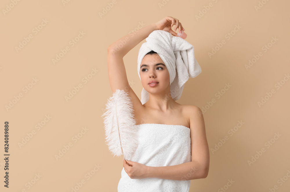 Beautiful young woman in towel with crystal deodorant and feather on beige background