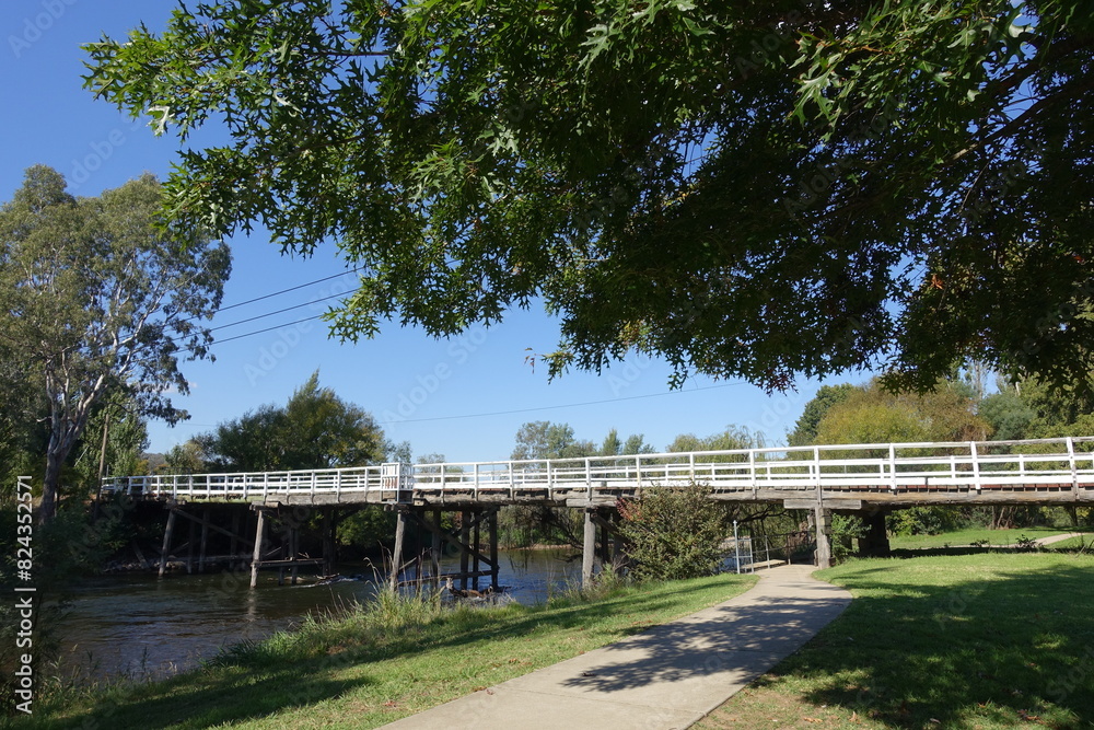 The iconic Old Town Bridge crosses the Tumut River in Bila Park, NSW, Australia.