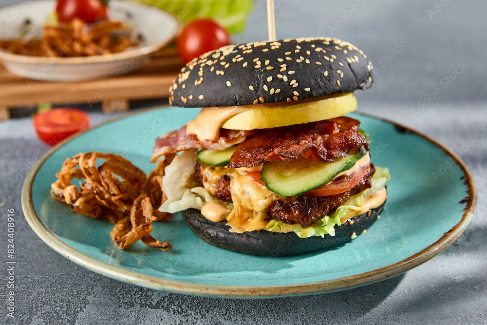 Gourmet black burger with bacon and crispy onions on a turquoise plate, gray textured backdrop with a hint of sunlight