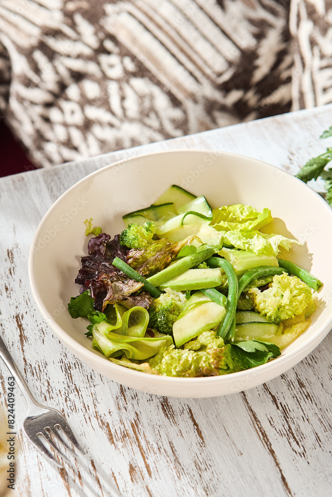 Healthy Vegan Green Salad with Zucchini, Avocado, and Green Beans Served on a Sunny Rustic Wooden Table