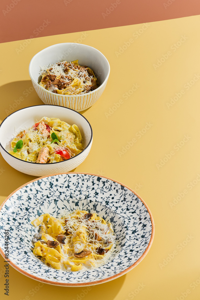 Delicious Assorted Pasta Dishes on Colorful Background - Italian Cuisine Stock Photo