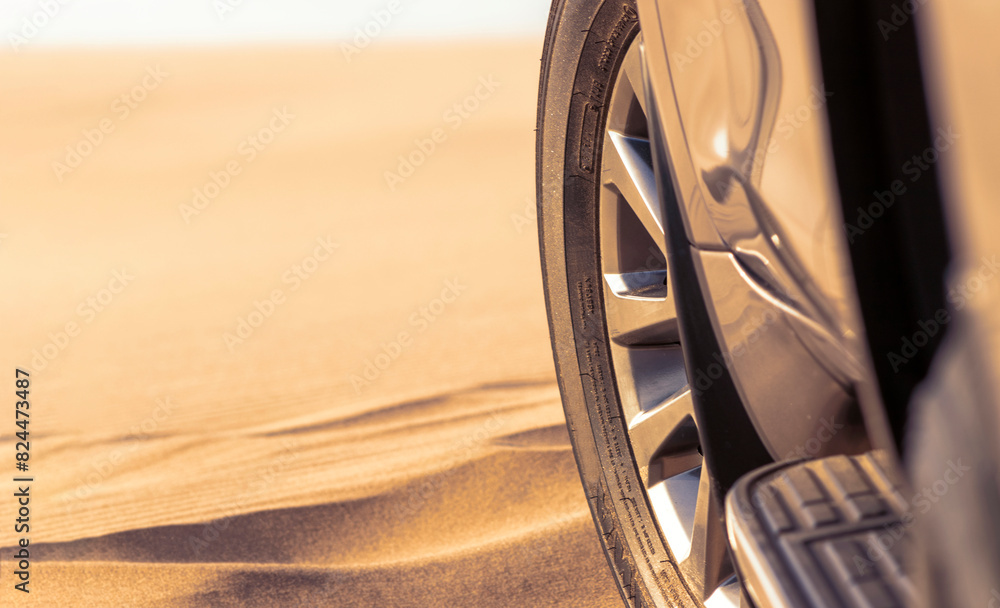 Close up of a golden car stuck in the sand in the Namib desert.