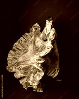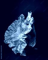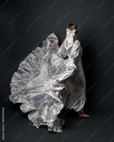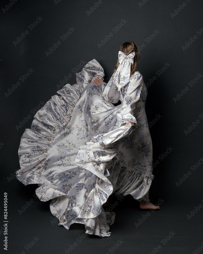 portrait of beautiful blonde female model wearing romantic historical gown white bridal floral pattern. standing pose running away from camera with flowing silk skirt. isolated dark studio background.