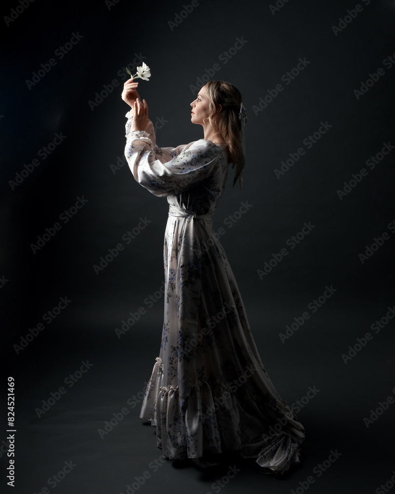 portrait of beautiful blonde female model wearing romantic historical gown white bridal floral pattern. standing pose with flowing silk skirt. isolated dark studio background.
