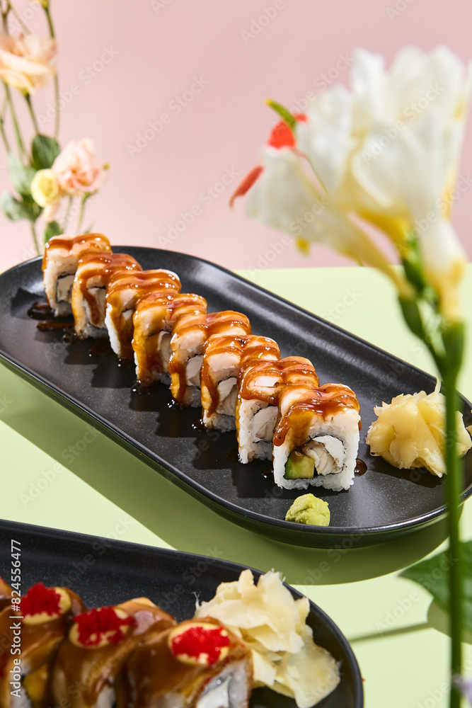 Eel and Avocado Roll Topped with Shrimp and Unagi Sauce. A surreal fusion of flavors and visual appeal for gourmet menus