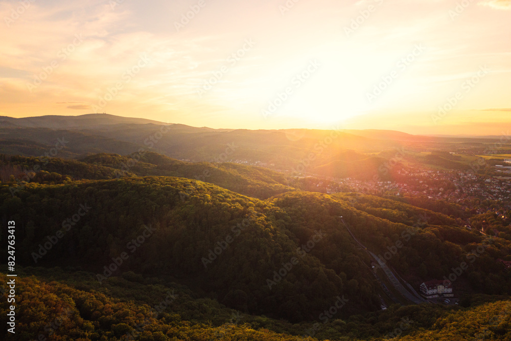 Harzlandschaft mit Sonnenuntergang und Blick zum Brocken