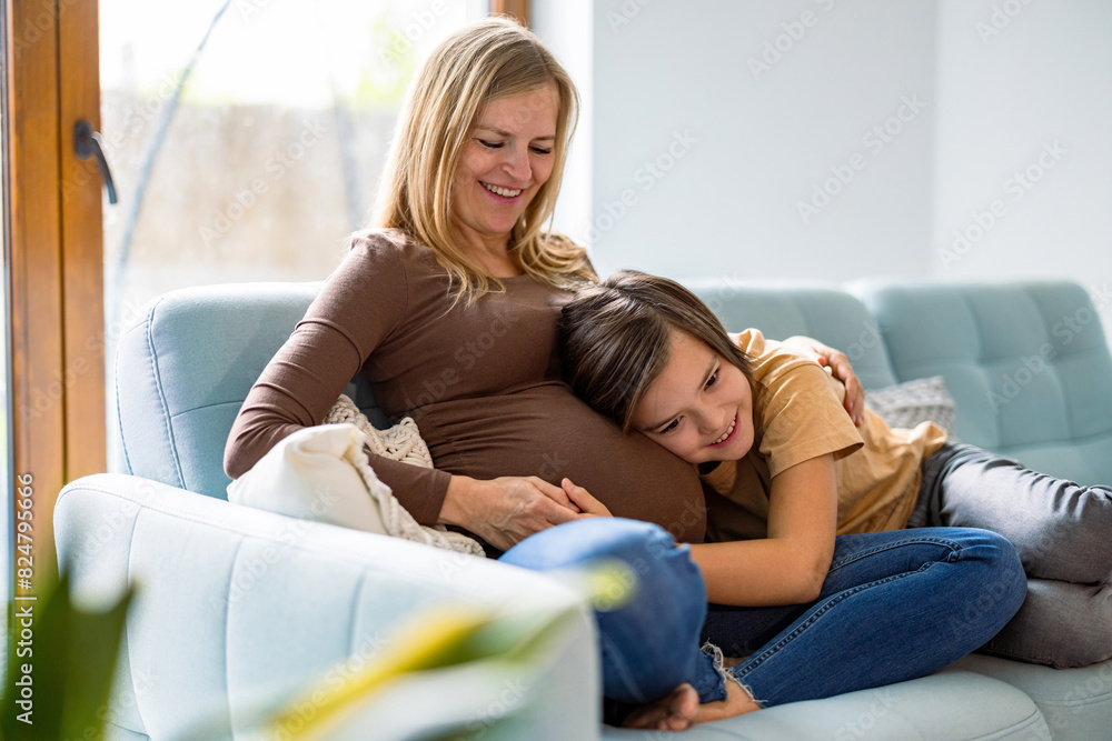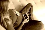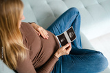 Pregnant woman sitting on sofa at home, looking at the ultrasound scan photo of her baby