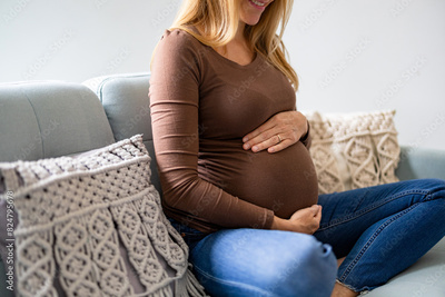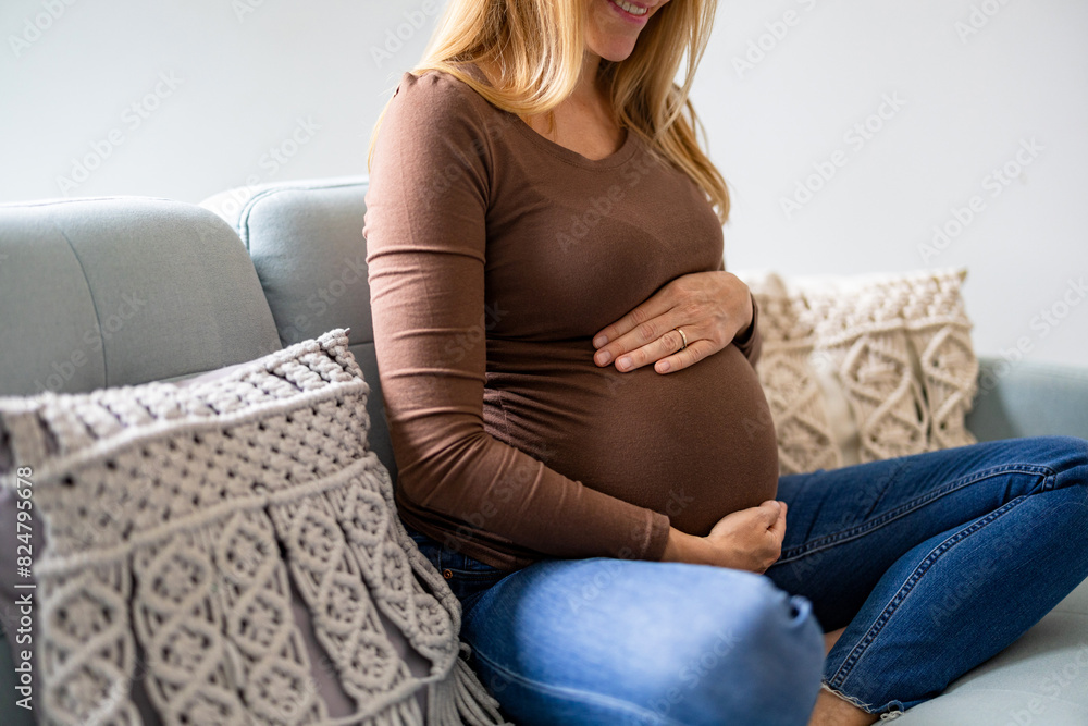 Pregnant woman touching her belly, relaxing on sofa at home