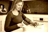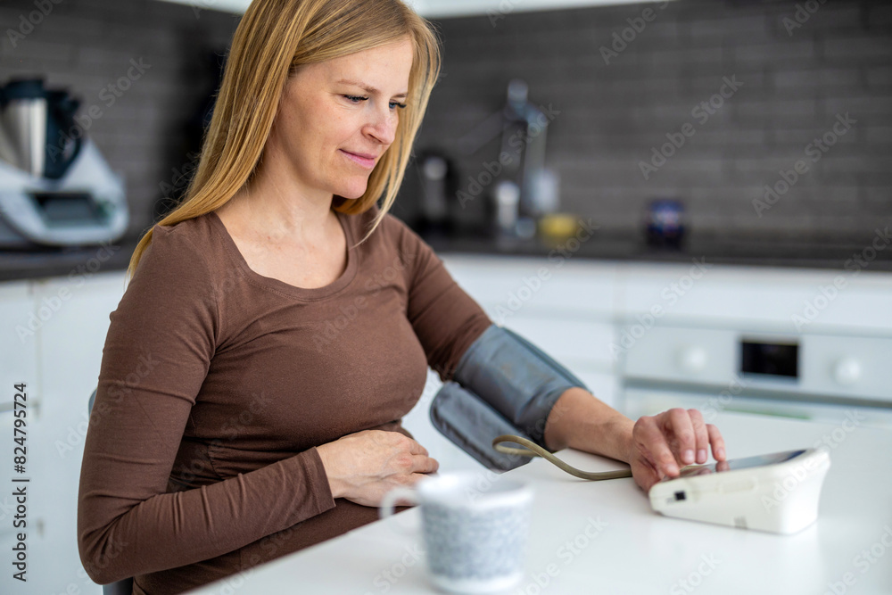 Pregnant woman measuring her blood pressure at home