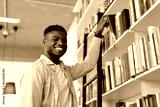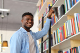 Young student reading textbook in university library, standing by bookshelf, focused on academic research.