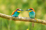 The European bee-eater (Merops apiaster) two birds sitting facing each other with their beaks