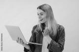Young excited smiling caucasian student freelancer woman using laptop for remote work, e-learning at university college, e-banking, online shopping isolated on yellow background