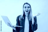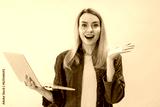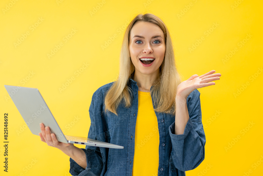 excited young blond girl holding laptop computer and celebrating success isolated over yellow background