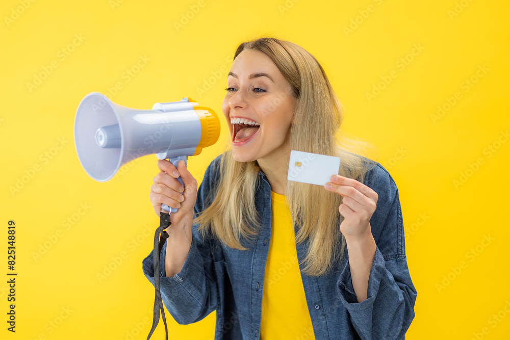 Energetic caucasian woman telling about discounts in stores over isolated yellow background scream in megaphone
