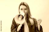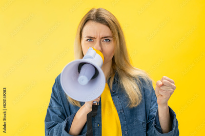 Aggressive woman shouting through a megaphone, marketing and communication concept