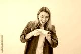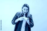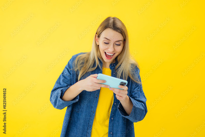Energetic lady gamer holding personal smartphone horizontally and playing online video game indoors. have fun time isolated over yellow studio background.