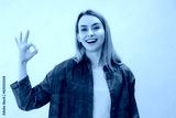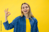 Smiling fun young woman in yellow sweater posing isolated on yellow wall background in studio. Look at camera approvingly say yes wow it is ok showing okay sign gesture