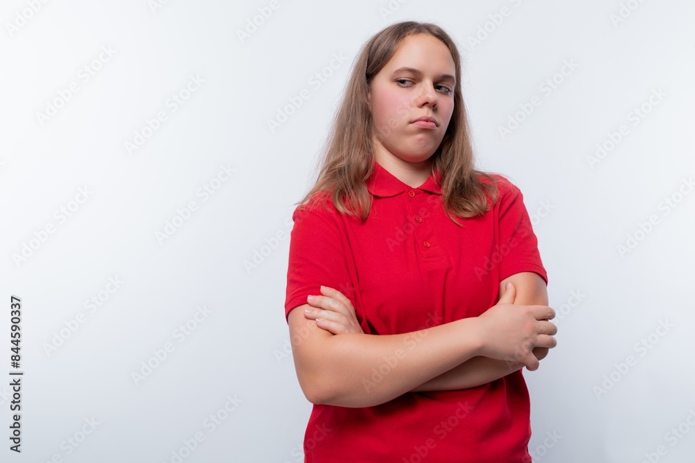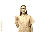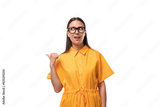 Caucasian young slender woman with black straight hair with glasses and in a yellow dress gesticulates with her fingers