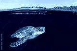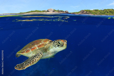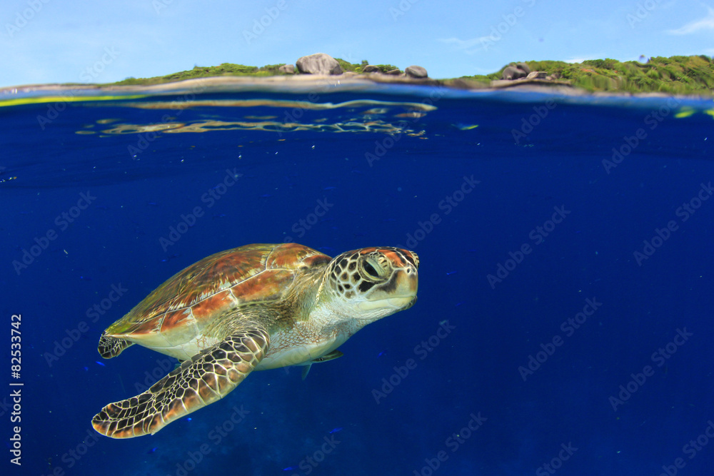 Green Sea Turtle swims in clear blue sea of Similan Islands