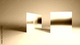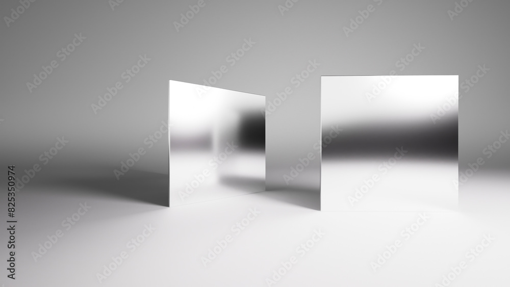 Mirrored shapes in polished silver steel with contrasting shadows and caustics. Simple square shapes over white background. 3d rendering.
