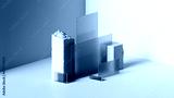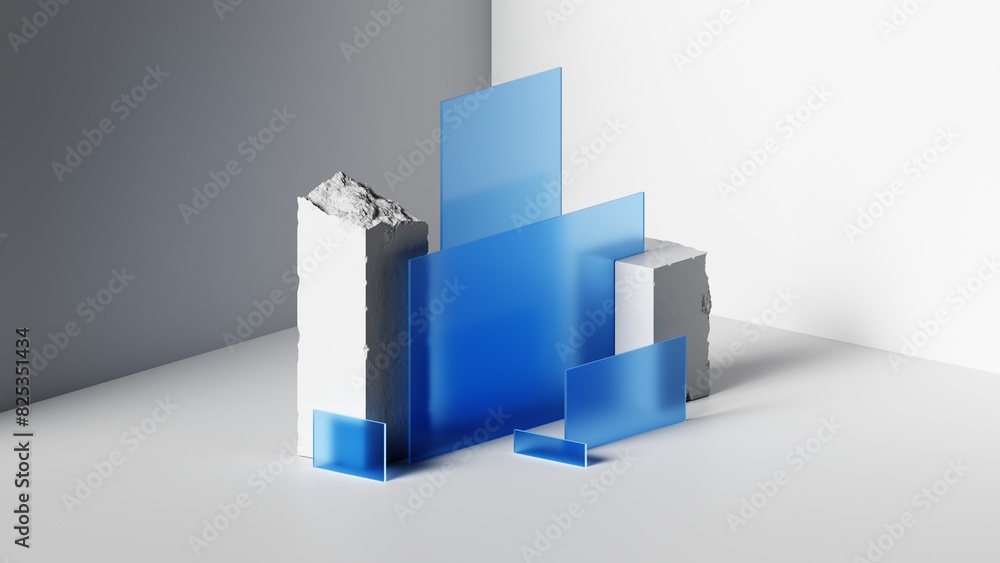 3d render. Abstract geometric background. Innovative fusion of rough white concrete and stone blocks and delicate blue glass plate in a minimalist trend-forward scene