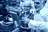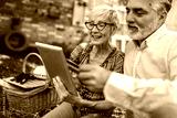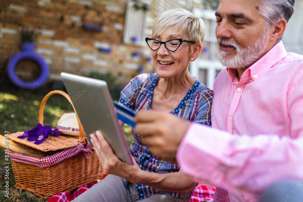 Happy senior couple having a picnic in park using digital tablet and credit card for online shopping