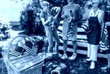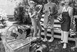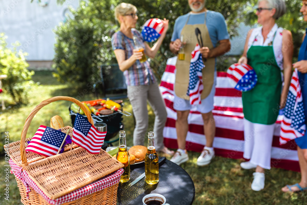 Happy senior friends having great time at at BBQ party. Elderly friends celebrating 4th of July outdoors with their friends and family.
