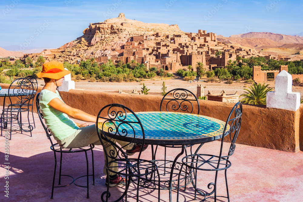 Young woman tourist sitting on hotel terrace in orange hat and looking at Ksar Ait Ben Haddou, old Berber adobe-brick village or kasbah, Ouarzazate, Morocco, North Africa