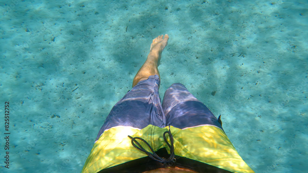 POV UNDERWATER: Sandy sea bottom and male legs swimming in crystal clear turquoise seawater. Unrecognizable young man in shorts enjoys a refreshing swim in blue Adriatic Sea during summer holidays.
