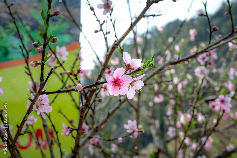 The peach blossoms blooming in spring on area the high mountains in Son La province, Vietnam.