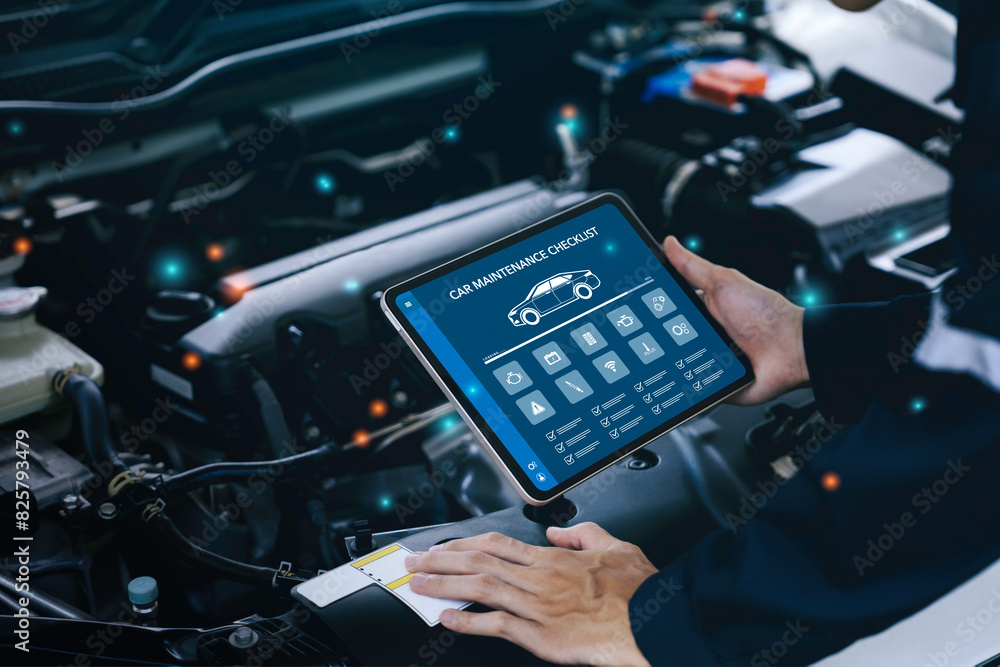 car service and checking concept. Hand of a mechanic holding the tablet for maintenance checklist vehicle, Software for manager check to repair, technology checkup automotive. Customer service concept