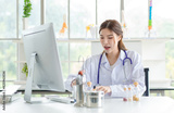 Asian woman doctor advise to use medicine in hospital examination room or clinic, treatment the disease with medicine from a specialist. Concept of medical treatment and healthcare consultation.