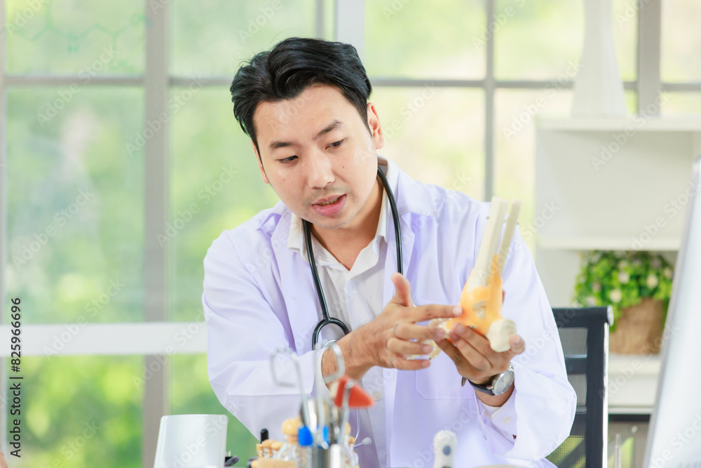 Close up shot asian smart man, orthopedic doctor consulting with leg injury explaining treatment methods of trauma using anatomical model foot. Treatment of embitterment, fracture of leg in hospital