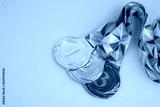 Three medals - gold, silver and bronze with blue ribbon on blue background.