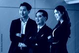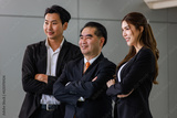 Asian confident successful professional business people team, male and female and group photo posing crossed arm, smiling standing in a row at office