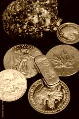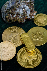 Pure gold rounds and bar - Precious metal. Calcite in Pyrite specimen from Mexico - Rocks and Minerals