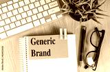 GENERIC BRAND text pink sticky on notebook with keyboard, pen and glasses
